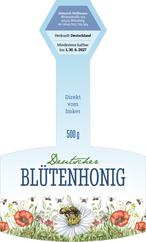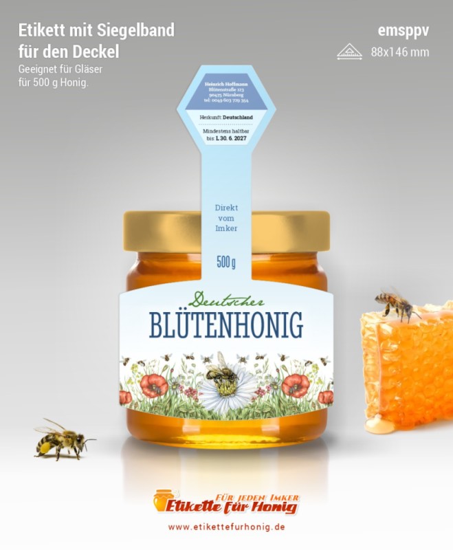Selbstklebende Etikette sechseckiger Form mit einem Band, geeignet sowohl für Gläser der üblichen Größen 500g, als auch für kleine Gläschen, wo sie als Hauptetikett auf dem Glas mit einem Band über den Deckel Verwendung finden. Passend für D.I.B. Gläser ( 500g)