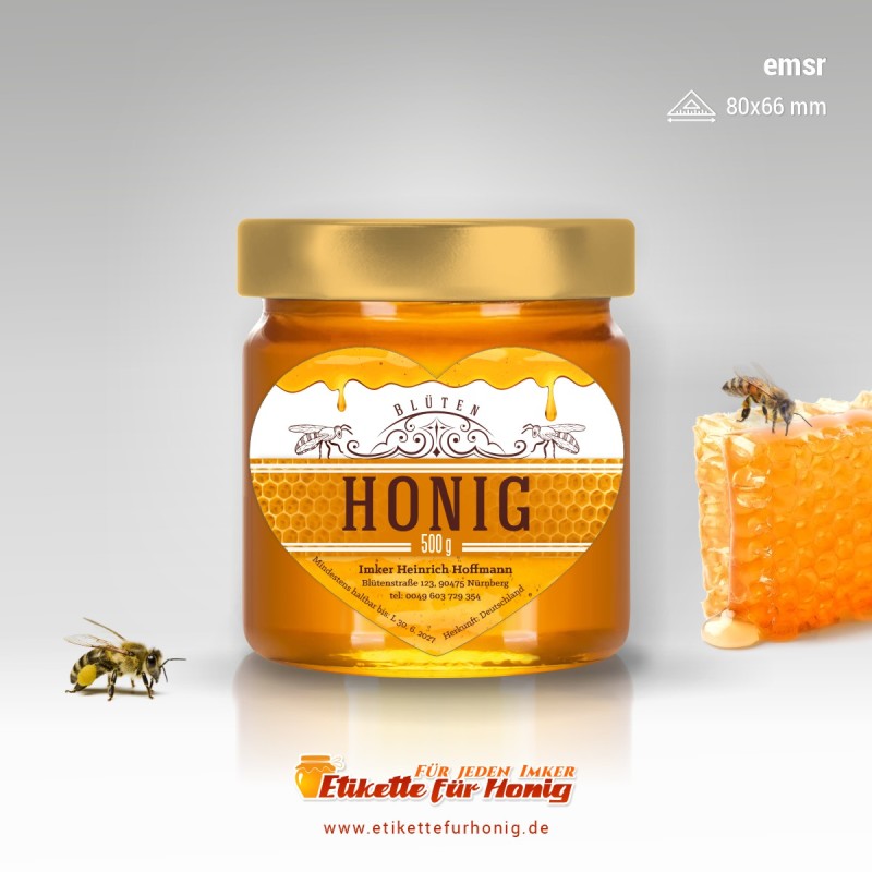 Etikette in Form Herzform, geeignet sowohl für Gläser aller Größen, als auch für Deckel, auf welche das Sechseck-Etikett der Abmessung 80 x 66 mm passt. Das ausgewählte Etikett passen wir Ihren Wünschen und Bedürfnissen an, geändert werden können die Art des Honigs, das deklarierte Gewicht, der Name des Imkers/Produzenten, die Adresse, der Kontakt, ggf. das Jahr. Diese unentgeltlichen Anpassungen geben Sie im Detail eines jeden Etiketts ein. Sonstige individuelle Abänderungen erfolgen auf Wunsch.