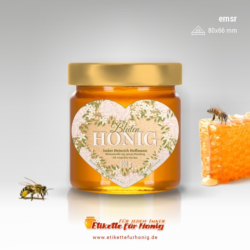 Etikette in Form Herzform, geeignet sowohl für Gläser aller Größen, als auch für Deckel, auf welche das Sechseck-Etikett der Abmessung 80 x 66 mm passt. Das ausgewählte Etikett passen wir Ihren Wünschen und Bedürfnissen an, geändert werden können die Art des Honigs, das deklarierte Gewicht, der Name des Imkers/Produzenten, die Adresse, der Kontakt, ggf. das Jahr. Diese unentgeltlichen Anpassungen geben Sie im Detail eines jeden Etiketts ein. Sonstige individuelle Abänderungen erfolgen auf Wunsch.