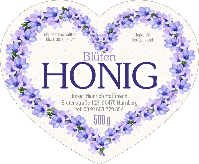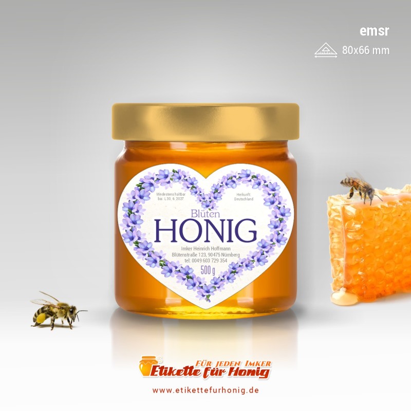 Etikette in Form Herzform, geeignet sowohl für Gläser aller Größen, als auch für Deckel, auf welche das Sechseck-Etikett der Abmessung 80 x 66 mm passt. Das ausgewählte Etikett passen wir Ihren Wünschen und Bedürfnissen an, geändert werden können die Art des Honigs, das deklarierte Gewicht, der Name des Imkers/Produzenten, die Adresse, der Kontakt, ggf. das Jahr. Diese unentgeltlichen Anpassungen geben Sie im Detail eines jeden Etiketts ein. Sonstige individuelle Abänderungen erfolgen auf Wunsch.