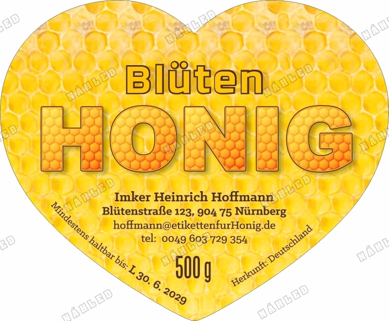 Etikette in Form Herzform, geeignet sowohl für Gläser aller Größen, als auch für Deckel, auf welche das Sechseck-Etikett der Abmessung 80 x 66 mm passt. Das ausgewählte Etikett passen wir Ihren Wünschen und Bedürfnissen an, geändert werden können die Art des Honigs, das deklarierte Gewicht, der Name des Imkers/Produzenten, die Adresse, der Kontakt, ggf. das Jahr. Diese unentgeltlichen Anpassungen geben Sie im Detail eines jeden Etiketts ein. Sonstige individuelle Abänderungen erfolgen auf Wunsch.