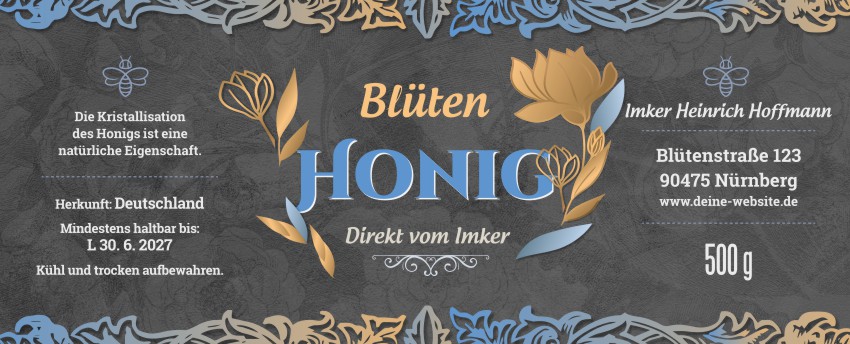 Das Etikett wird nach Ihren angegebenen Daten angepasst.Wir fügen Ihr Logo, Ihre Marke oder Ihr eigenes Bild in die Vorlage ein. Bitte laden Sie das Logo in der Bestellung hoch oder senden Sie es per E‑Mail.Wir färben das Etikett in Ihre Wunschfarben um (z. B. Farbe der Honigsorte, Firmenfarben, anderer Hintergrundton). Beschreiben Sie Ihre Vorstellung oder Farbangabe im Hinweisfeld.Wir passen die Schrift nach Ihren Wünschen an (anderer Stil, anderer Charakter). Beschreiben Sie Ihre Vorstellung im Hinweisfeld.Verschieben von Texten, Größenänderungen, andere Anordnung der Elemente innerhalb der Vorlage. Beschreiben Sie Ihre Vorstellung im Hinweisfeld.Wir fügen Ihr Foto ein (z. B. Bienenstöcke, Bienen, Landschaft). Bitte laden Sie das Foto in der Bestellung hoch oder senden Sie es per E‑Mail.Hinzufügen kleiner Elemente (Biene, Blume, Ornament), Detailanpassungen über die Standard‑Personalisierung hinaus. Beschreiben Sie Ihre Vorstellung im Hinweisfeld.Größere grafische Eingriffe, aber weiterhin auf Basis der Vorlage (deutlichere Änderungen, mehrere Anpassungen gleichzeitig). Beschreiben Sie Ihre Vorstellung im Hinweisfeld.Umfassende Überarbeitung des Designs, aber weiterhin auf Basis der Vorlage (deutliche Änderungen und Anpassungen, mehrere Eingriffe gleichzeitig). Beschreiben Sie Ihre Vorstellung im Hinweisfeld.