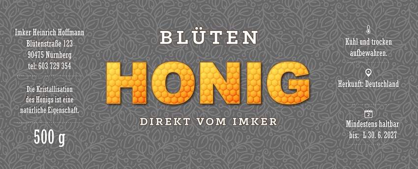 Wählen Sie die Honigsorte oder schreiben Sie Ihre eigene.Geben Sie Ihre Bezeichnung der Honigsorte ein.„Auf dem Etikett wird die ausgewählte Honigsorte angegeben.„Auf dem Etikett wird die ausgewählte Honigsorte angegeben.„Auf dem Etikett wird die ausgewählte Honigsorte angegeben.„Auf dem Etikett wird die ausgewählte Honigsorte angegeben.„Auf dem Etikett wird die ausgewählte Honigsorte angegeben.„Auf dem Etikett wird die ausgewählte Honigsorte angegeben.„Auf dem Etikett wird die ausgewählte Honigsorte angegeben.„Auf dem Etikett wird die ausgewählte Honigsorte angegeben.„Auf dem Etikett wird die ausgewählte Honigsorte angegeben.„Auf dem Etikett wird die ausgewählte Honigsorte angegeben.„Auf dem Etikett wird die ausgewählte Honigsorte angegeben.„Es wird keine Honigsorte angegeben. Es bleibt nur die Bezeichnung HONIG.