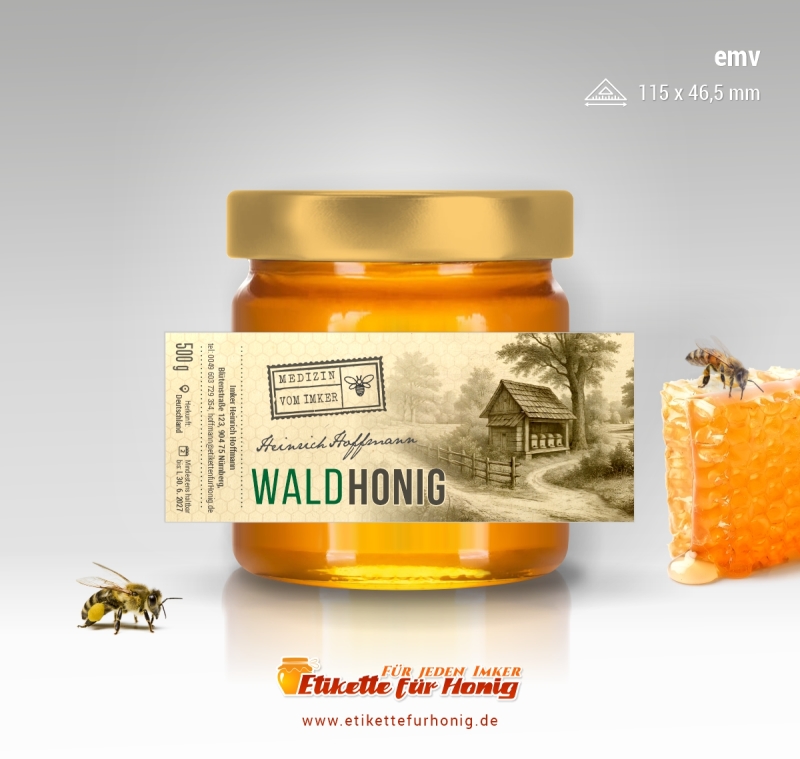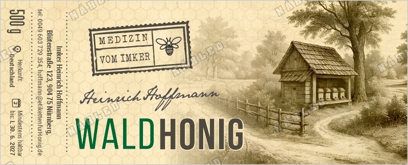 Das Etikett wird nach Ihren angegebenen Daten angepasst.Wir fügen Ihr Logo, Ihre Marke oder Ihr eigenes Bild in die Vorlage ein. Bitte laden Sie das Logo in der Bestellung hoch oder senden Sie es per E‑Mail.Wir färben das Etikett in Ihre Wunschfarben um (z. B. Farbe der Honigsorte, Firmenfarben, anderer Hintergrundton). Beschreiben Sie Ihre Vorstellung oder Farbangabe im Hinweisfeld.Wir passen die Schrift nach Ihren Wünschen an (anderer Stil, anderer Charakter). Beschreiben Sie Ihre Vorstellung im Hinweisfeld.Verschieben von Texten, Größenänderungen, andere Anordnung der Elemente innerhalb der Vorlage. Beschreiben Sie Ihre Vorstellung im Hinweisfeld.Wir fügen Ihr Foto ein (z. B. Bienenstöcke, Bienen, Landschaft). Bitte laden Sie das Foto in der Bestellung hoch oder senden Sie es per E‑Mail.Hinzufügen kleiner Elemente (Biene, Blume, Ornament), Detailanpassungen über die Standard‑Personalisierung hinaus. Beschreiben Sie Ihre Vorstellung im Hinweisfeld.Größere grafische Eingriffe, aber weiterhin auf Basis der Vorlage (deutlichere Änderungen, mehrere Anpassungen gleichzeitig). Beschreiben Sie Ihre Vorstellung im Hinweisfeld.Umfassende Überarbeitung des Designs, aber weiterhin auf Basis der Vorlage (deutliche Änderungen und Anpassungen, mehrere Eingriffe gleichzeitig). Beschreiben Sie Ihre Vorstellung im Hinweisfeld.