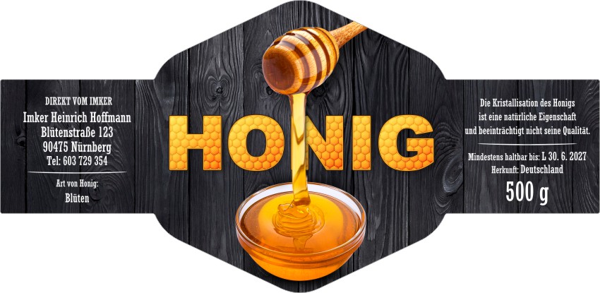 Wählen Sie die Honigsorte oder schreiben Sie Ihre eigene.Geben Sie Ihre Bezeichnung der Honigsorte ein.„Auf dem Etikett wird die ausgewählte Honigsorte angegeben.„Auf dem Etikett wird die ausgewählte Honigsorte angegeben.„Auf dem Etikett wird die ausgewählte Honigsorte angegeben.„Auf dem Etikett wird die ausgewählte Honigsorte angegeben.„Auf dem Etikett wird die ausgewählte Honigsorte angegeben.„Auf dem Etikett wird die ausgewählte Honigsorte angegeben.„Auf dem Etikett wird die ausgewählte Honigsorte angegeben.„Auf dem Etikett wird die ausgewählte Honigsorte angegeben.„Auf dem Etikett wird die ausgewählte Honigsorte angegeben.„Auf dem Etikett wird die ausgewählte Honigsorte angegeben.„Auf dem Etikett wird die ausgewählte Honigsorte angegeben.„Es wird keine Honigsorte angegeben. Es bleibt nur die Bezeichnung HONIG.