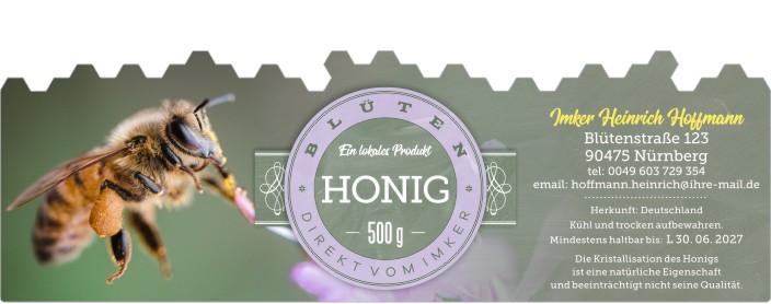 Wählen Sie die Honigsorte oder schreiben Sie Ihre eigene.Geben Sie Ihre Bezeichnung der Honigsorte ein.„Auf dem Etikett wird die ausgewählte Honigsorte angegeben.„Auf dem Etikett wird die ausgewählte Honigsorte angegeben.„Auf dem Etikett wird die ausgewählte Honigsorte angegeben.„Auf dem Etikett wird die ausgewählte Honigsorte angegeben.„Auf dem Etikett wird die ausgewählte Honigsorte angegeben.„Auf dem Etikett wird die ausgewählte Honigsorte angegeben.„Auf dem Etikett wird die ausgewählte Honigsorte angegeben.„Auf dem Etikett wird die ausgewählte Honigsorte angegeben.„Auf dem Etikett wird die ausgewählte Honigsorte angegeben.„Auf dem Etikett wird die ausgewählte Honigsorte angegeben.„Auf dem Etikett wird die ausgewählte Honigsorte angegeben.„Es wird keine Honigsorte angegeben. Es bleibt nur die Bezeichnung HONIG.
