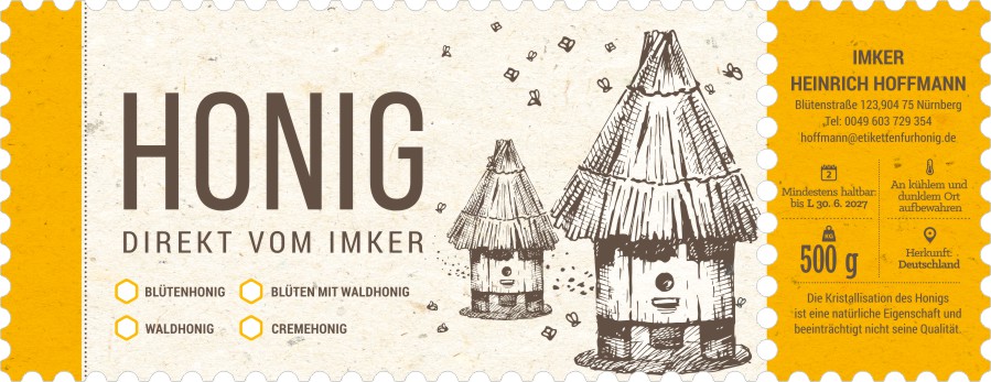 Das Etikett wird nach Ihren angegebenen Daten angepasst.Wir fügen Ihr Logo, Ihre Marke oder Ihr eigenes Bild in die Vorlage ein. Bitte laden Sie das Logo in der Bestellung hoch oder senden Sie es per E‑Mail.Wir färben das Etikett in Ihre Wunschfarben um (z. B. Farbe der Honigsorte, Firmenfarben, anderer Hintergrundton). Beschreiben Sie Ihre Vorstellung oder Farbangabe im Hinweisfeld.Wir passen die Schrift nach Ihren Wünschen an (anderer Stil, anderer Charakter). Beschreiben Sie Ihre Vorstellung im Hinweisfeld.Verschieben von Texten, Größenänderungen, andere Anordnung der Elemente innerhalb der Vorlage. Beschreiben Sie Ihre Vorstellung im Hinweisfeld.Wir fügen Ihr Foto ein (z. B. Bienenstöcke, Bienen, Landschaft). Bitte laden Sie das Foto in der Bestellung hoch oder senden Sie es per E‑Mail.Hinzufügen kleiner Elemente (Biene, Blume, Ornament), Detailanpassungen über die Standard‑Personalisierung hinaus. Beschreiben Sie Ihre Vorstellung im Hinweisfeld.Größere grafische Eingriffe, aber weiterhin auf Basis der Vorlage (deutlichere Änderungen, mehrere Anpassungen gleichzeitig). Beschreiben Sie Ihre Vorstellung im Hinweisfeld.Umfassende Überarbeitung des Designs, aber weiterhin auf Basis der Vorlage (deutliche Änderungen und Anpassungen, mehrere Eingriffe gleichzeitig). Beschreiben Sie Ihre Vorstellung im Hinweisfeld.