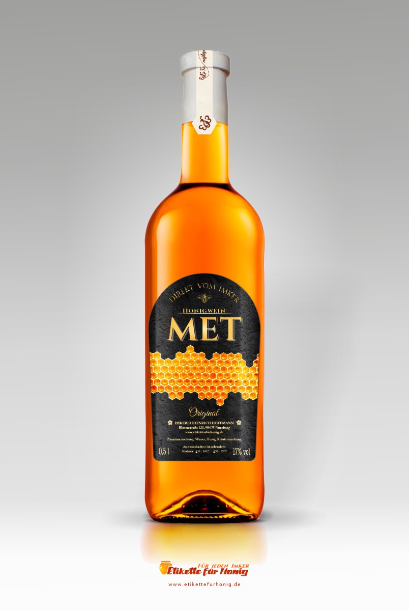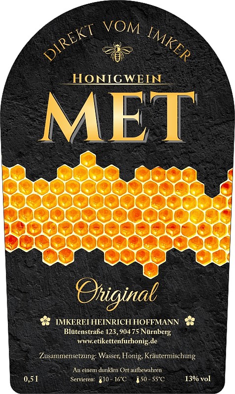 Etikett für die Metflasche. Das Etikett ist selbstklebend und hat das Format 68 x 114 mm. Das Etikett passen wir Ihrem Wunsch entsprechend a, ändern können Sie es mittels der Parameter - siehe oben. Diese Abänderungen geben Sie unentgeltlich im Detail eines jeden Etiketts ein.