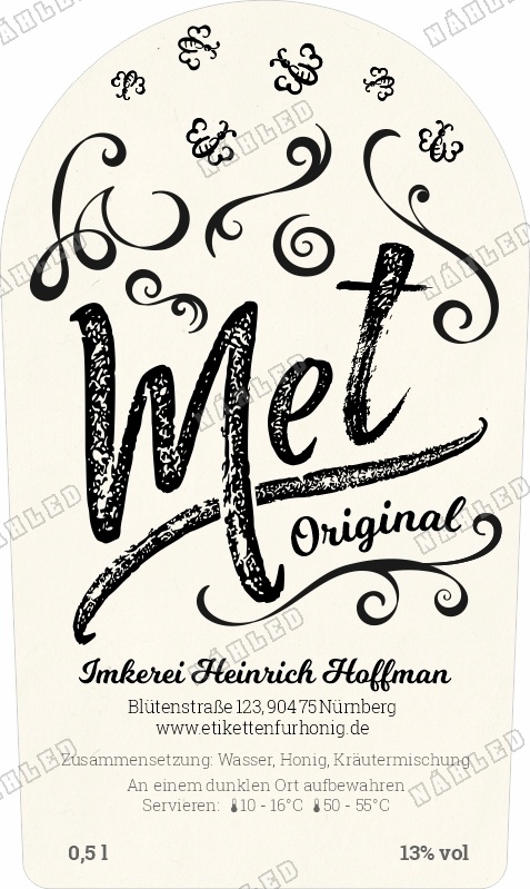 Etikett für die Metflasche. Das Etikett ist selbstklebend und hat das Format 68 x 114 mm. Das Etikett passen wir Ihrem Wunsch entsprechend a, ändern können Sie es mittels der Parameter - siehe oben. Diese Abänderungen geben Sie unentgeltlich im Detail eines jeden Etiketts ein.