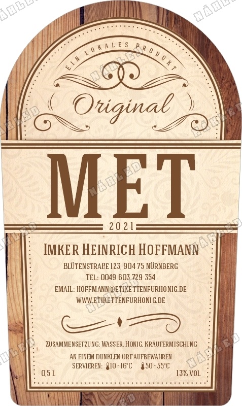 Etikett für die Metflasche. Das Etikett ist selbstklebend und hat das Format 68 x 114 mm. Das Etikett passen wir Ihrem Wunsch entsprechend a, ändern können Sie es mittels der Parameter - siehe oben. Diese Abänderungen geben Sie unentgeltlich im Detail eines jeden Etiketts ein.