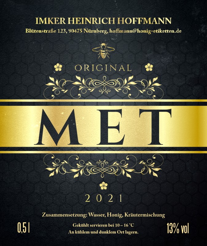 Das Etikett wird nach Ihren angegebenen Daten angepasst.Wir fügen Ihr Logo, Ihre Marke oder Ihr eigenes Bild in die Vorlage ein. Bitte laden Sie das Logo in der Bestellung hoch oder senden Sie es per E‑Mail.Wir färben das Etikett in Ihre Wunschfarben um (z. B. Farbe der Honigsorte, Firmenfarben, anderer Hintergrundton). Beschreiben Sie Ihre Vorstellung oder Farbangabe im Hinweisfeld.Wir passen die Schrift nach Ihren Wünschen an (anderer Stil, anderer Charakter). Beschreiben Sie Ihre Vorstellung im Hinweisfeld.Verschieben von Texten, Größenänderungen, andere Anordnung der Elemente innerhalb der Vorlage. Beschreiben Sie Ihre Vorstellung im Hinweisfeld.Wir fügen Ihr Foto ein (z. B. Bienenstöcke, Bienen, Landschaft). Bitte laden Sie das Foto in der Bestellung hoch oder senden Sie es per E‑Mail.Hinzufügen kleiner Elemente (Biene, Blume, Ornament), Detailanpassungen über die Standard‑Personalisierung hinaus. Beschreiben Sie Ihre Vorstellung im Hinweisfeld.Größere grafische Eingriffe, aber weiterhin auf Basis der Vorlage (deutlichere Änderungen, mehrere Anpassungen gleichzeitig). Beschreiben Sie Ihre Vorstellung im Hinweisfeld.Umfassende Überarbeitung des Designs, aber weiterhin auf Basis der Vorlage (deutliche Änderungen und Anpassungen, mehrere Eingriffe gleichzeitig). Beschreiben Sie Ihre Vorstellung im Hinweisfeld.
