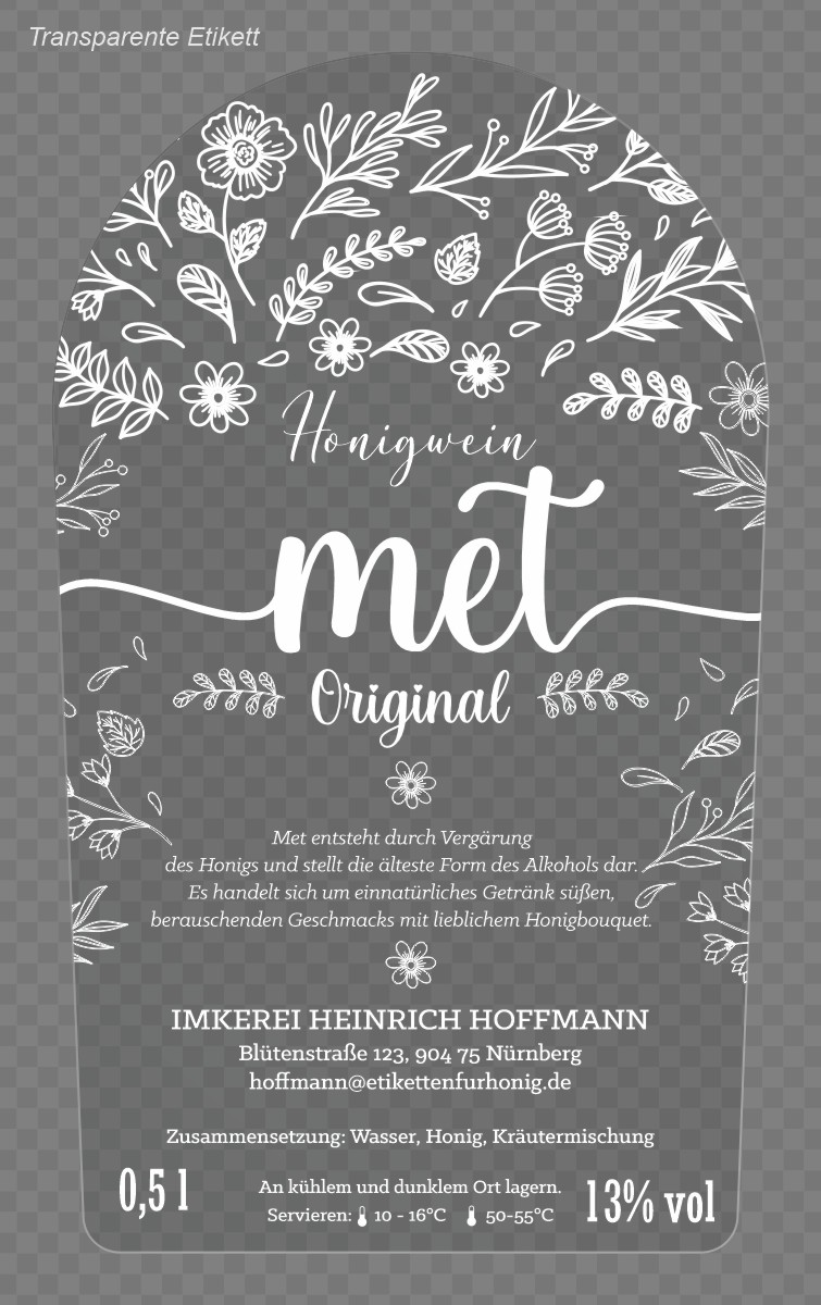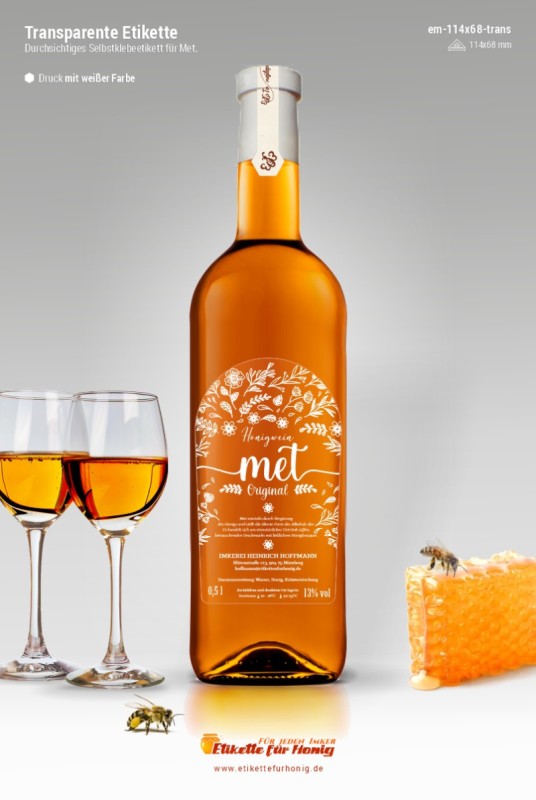 Etikett für eine Flasche Met mit einem Volumen von z. B. 0,5 l, 0,75 l oder 1 l. Das Etikett ist transparent, selbstklebend und hat die Maße 68×114 mm. Das Etikett passen wir gerne nach Ihren Wünschen an – die oben genannten Parameter können geändert werden. Diese Anpassungen können im Detail jeder Etikette angegeben werden und sind kostenlos.