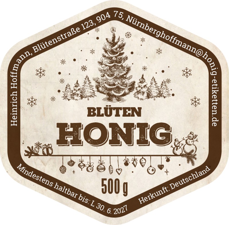 Das Etikett wird nach Ihren angegebenen Daten angepasst.Wir fügen Ihr Logo, Ihre Marke oder Ihr eigenes Bild in die Vorlage ein. Bitte laden Sie das Logo in der Bestellung hoch oder senden Sie es per E‑Mail.Wir färben das Etikett in Ihre Wunschfarben um (z. B. Farbe der Honigsorte, Firmenfarben, anderer Hintergrundton). Beschreiben Sie Ihre Vorstellung oder Farbangabe im Hinweisfeld.Wir passen die Schrift nach Ihren Wünschen an (anderer Stil, anderer Charakter). Beschreiben Sie Ihre Vorstellung im Hinweisfeld.Verschieben von Texten, Größenänderungen, andere Anordnung der Elemente innerhalb der Vorlage. Beschreiben Sie Ihre Vorstellung im Hinweisfeld.Wir fügen Ihr Foto ein (z. B. Bienenstöcke, Bienen, Landschaft). Bitte laden Sie das Foto in der Bestellung hoch oder senden Sie es per E‑Mail.Hinzufügen kleiner Elemente (Biene, Blume, Ornament), Detailanpassungen über die Standard‑Personalisierung hinaus. Beschreiben Sie Ihre Vorstellung im Hinweisfeld.Größere grafische Eingriffe, aber weiterhin auf Basis der Vorlage (deutlichere Änderungen, mehrere Anpassungen gleichzeitig). Beschreiben Sie Ihre Vorstellung im Hinweisfeld.Umfassende Überarbeitung des Designs, aber weiterhin auf Basis der Vorlage (deutliche Änderungen und Anpassungen, mehrere Eingriffe gleichzeitig). Beschreiben Sie Ihre Vorstellung im Hinweisfeld.