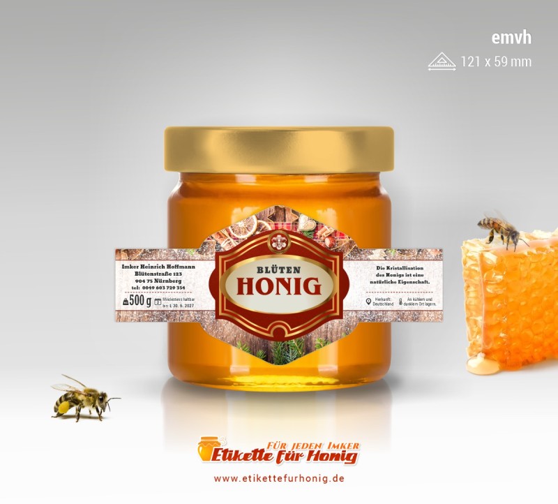 Selbstklebende Etikette für Honig in Sechseckform, geeignet für Gläser größeren und kleineren Volumens, auf denen das Etikett der Abmessung 121 x 59 mm gewiss Platz findet.